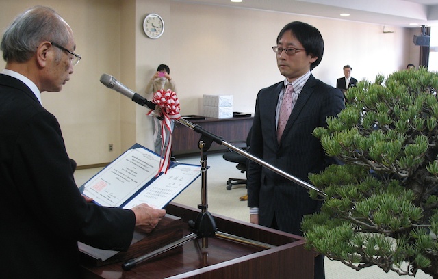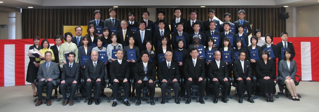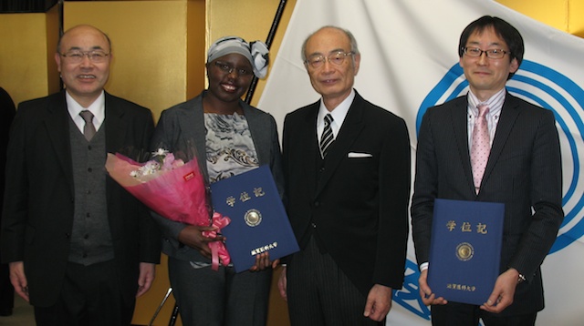 学位授与式にて、大学院生のBisem, NAOMI JEPCHIRCHIRさんと北西剛先生に医学博士号が授与されました。