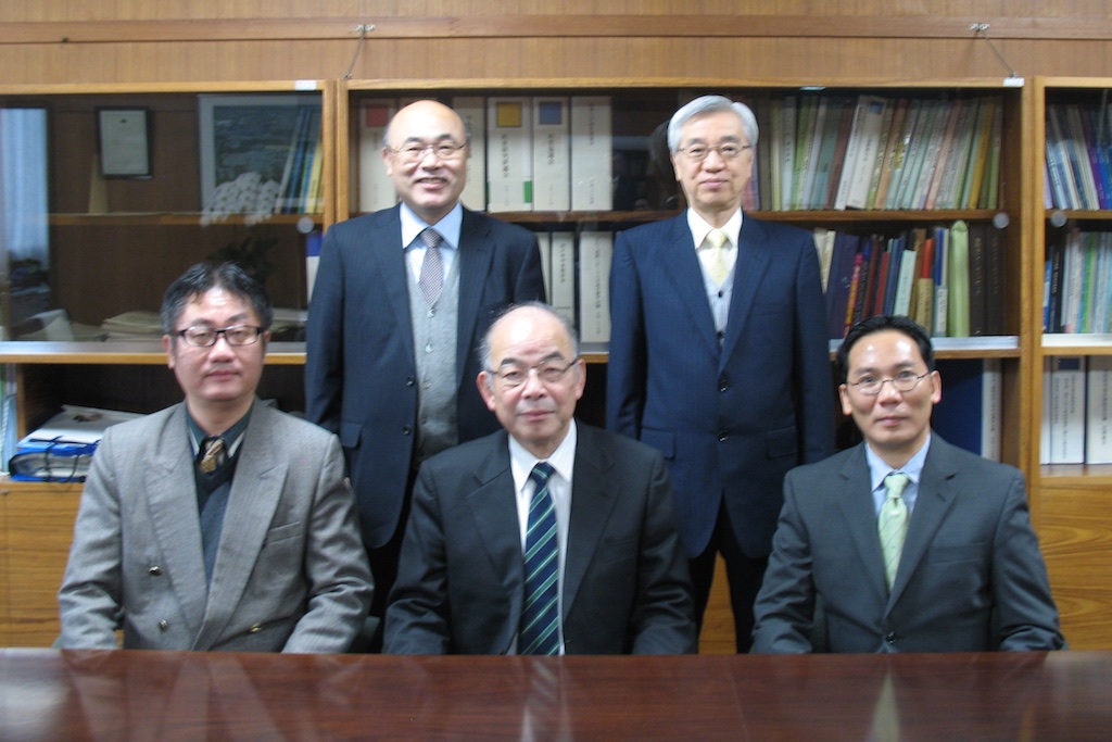 前列左から、Jin教授、塩田学長、Pham博士、後列左から遠山センター長、堀池副学長