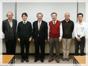 ![]() 左から礒野准教授、漆谷准教授、KIM教授、 田口特任教授、ベリエ助教、牧野助教 |