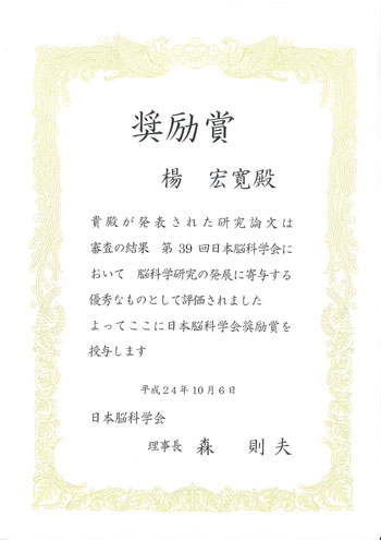 2012年10月6日第39回日本脳科学会において神経難病診断学分野の大学院1年生の楊銘春君が、「ミトコンドリアフェリチンの抗体作製と細胞組織化学への応用」について、大学院2年生の楊宏寛君が、「アルツハイマー病脳におけるミトコンドリアフェリチンの発現とその機能的意義」について口頭発表しました。楊宏寛君は、日本脳科学会研究奨励賞を受賞しました。