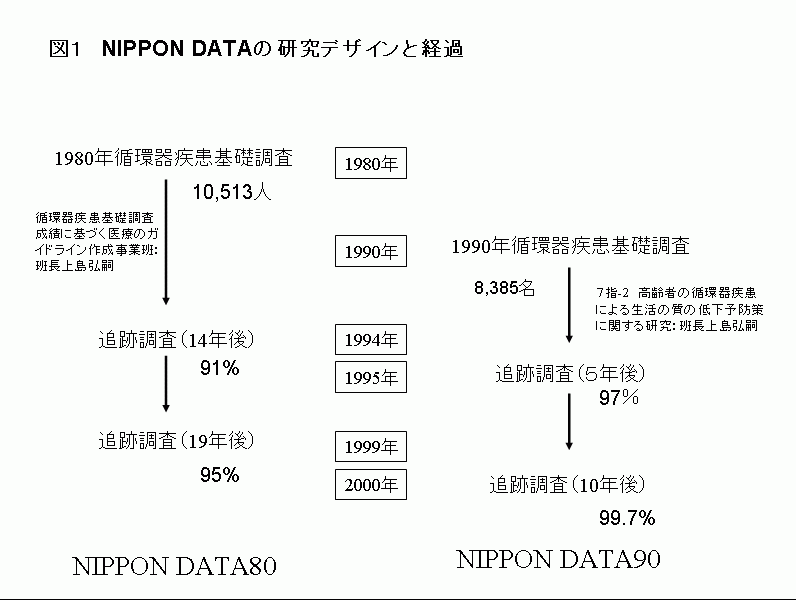 本研究は国民を代表する集団の追跡調査成績であることと、その対象の1980年、1990年はそれぞれ1万人(NIPPON DATA80)、8000人(NIPPON DATA90)という規模の大きさに特徴がある。1994年にはじめて後ろ向きに1980年の厚生労働省の循環器疾患基礎調査を追跡調査として、生死の予後と65歳以上の高齢者に対する日常生活動作能力(ADL)を追跡することとなった(図1)。