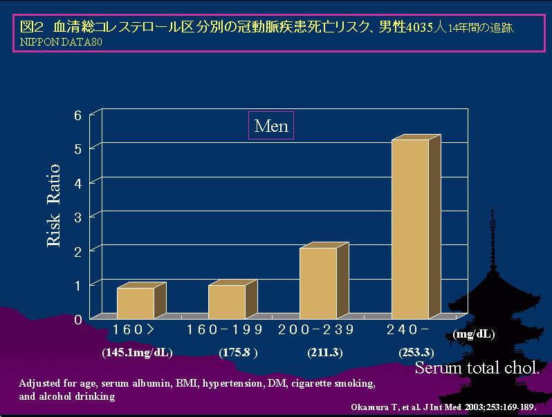 図2 血清総コレステロール区分別の冠動脈疾患死亡リスク、男性4035人14年間の追跡、NIPPON DATA80