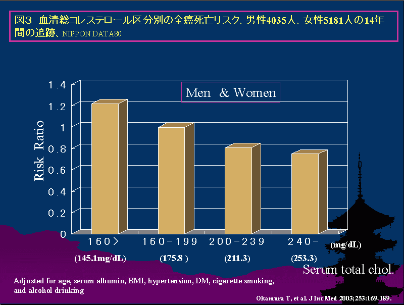 図3 血清総コレステロール区分別の全癌死亡リスク、男性4035人、女性5181人の14年間の追跡、NIPPON DATA80