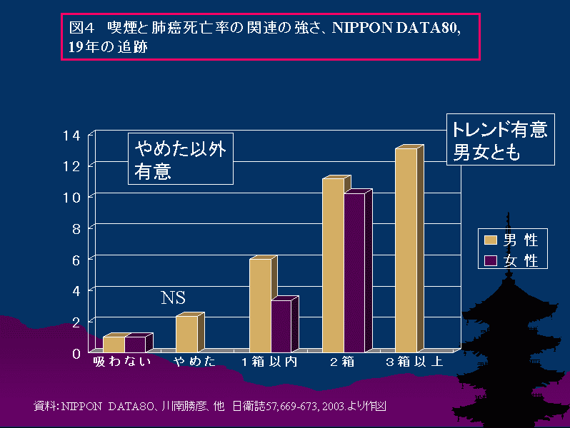 図4 喫煙と肺癌死亡率の関連の強さ19年の追跡、NIPPON DATA80