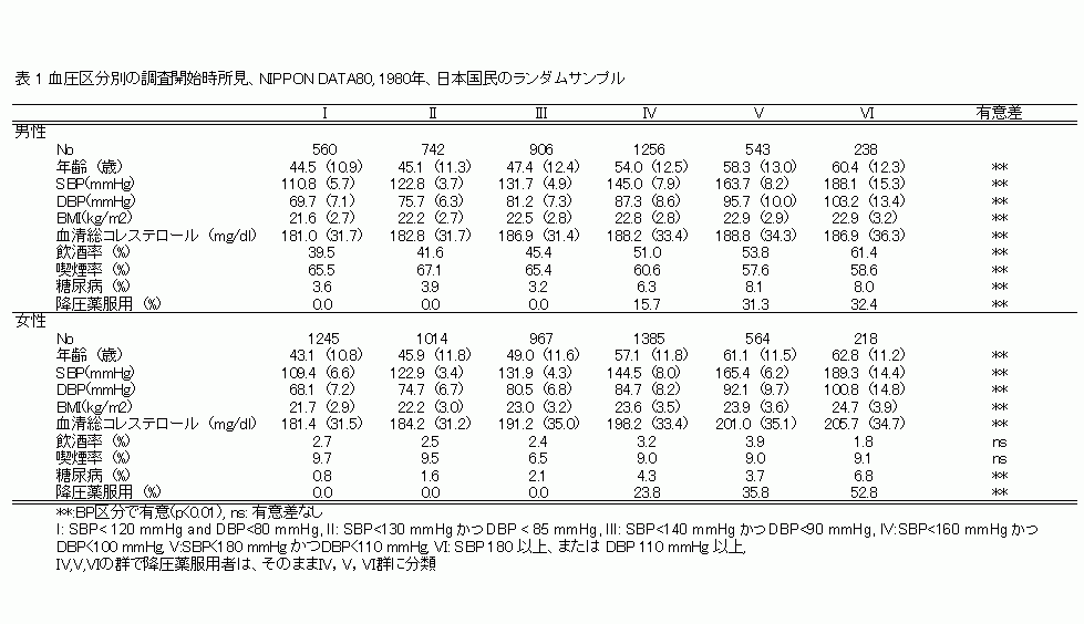 表1 血圧区分別の調査開始時所見、NIPPON DATA80, 1980年、日本国民のランダムサンプル