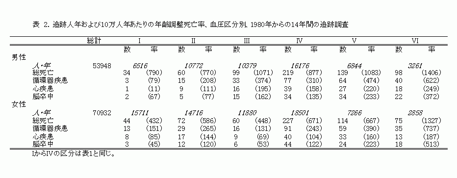 表2 追跡人年および10万人年あたりの年齢調整死亡率、血圧区分別、1980年からの14年間の追跡調査