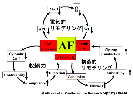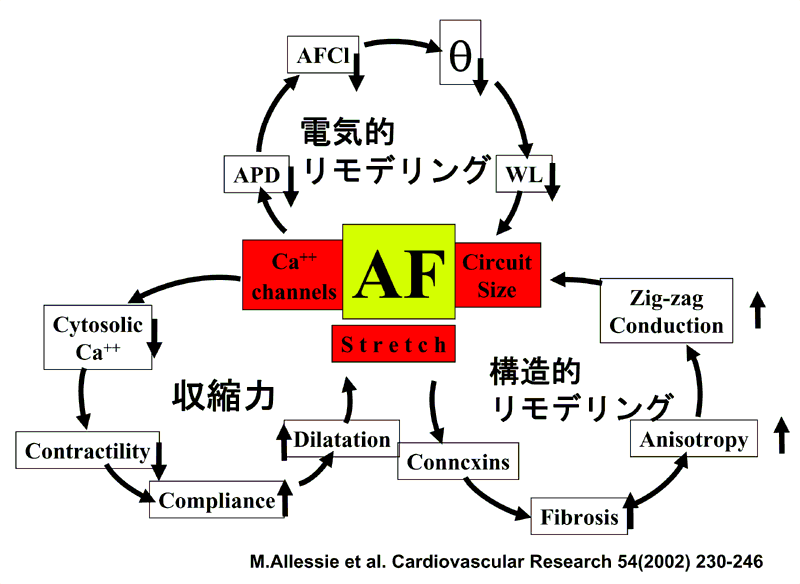 レニン・アンギオテンシン・アルドステロン(renin-angiotensin-aldosterone: RAA系抑制は心不全におけるスタンダード治療 このように心房細動と脳血管障害、心不全は切っても切れない関連がありますが、心不全治療は、昨今、急速な進歩を見せています。RAA系の抑制が心不全の原因となる左心室のリモデリングを予防し、ひいては心不全患者の生命予後を改善することが、多くの臨床治験から示されています。なかでも、ARB (Angiotensin Receptor Blocker)は、angiotensin 1 receptorを選択的に阻害することにより、angiotensinII (Ang II)のfinal common pathwayを断ち切り、より切れ味のよいリモデリング阻止作用があります。ACEI (angiotensin converting enzyme inhibitor)では阻害されないキマーゼ系を介したAngIIの関与が示唆されます。 また、完全なRAA系の阻害を目指すには、シグナル伝達のより下流であり、心筋リモデリングにより直裁的に働くangiotensin 1 (AT1) receptorを阻害することが理にかなっています。Ang IIの受容体には、AT1とAT2がありますが、各種ノックアウトマウスの実験から、AT1とAT2受容体を介する反応は相反すること、AT1受容体が心筋肥大に働くのに対しAT2受容体は、これに拮抗的に作用することもわかってきました。したがってACEIによるAngII合成の阻害では、保護的に働くAT2受容体も抑制してしまうことになります。 最近になって、ARBの慢性心不全におけるARBは少なくともACEIと同等の治療効果を挙げることが、Val-HeFT (Valsarta Heart Failure Trial)試験やCHARM (Candesartan in Heart Failure Assessment in Mortality and Morbidity)試験で証明されました。さらに、2003年になって、梗塞後の心室リモデリングに関しても、ARBがACEI(カプトリル)と同等な抑制作用をことが報告されました(VALIANT試験)。すなわち、急性心筋梗塞後の患者に投与されたバルサルタンは、総死亡と心イベント発症を有意に減少しました。このようにACEIのみならずARBによるRAA系抑制は心不全におけるスタンダード治療となりつつあります。このような状況を踏まえて、本邦で開発されたカンデサルタンは、昨年、慢性心不全に適応をとっています。 RAA系と心房細動 さて、Ang IIの臓器障害は多岐にわたりますが、最近、心臓においても心室のみならず心房筋でも、心筋の進展(stretch)をトリガーとして、心房組織のRAA系が活性化されその線維化が促進されることが示されました。次いで、これは心筋の伝導不均一を起こして、心房細動が維持される解剖学的な素地を与えることになります(解剖学的な心房リモデリング1):図2)。心房細動は、いったん、発症すると経過と共に、その持続時間が長くなり最後には恒久化しますが、この現象をAllessieら2)は、Atrial fibrillation begets atrial fibrillation(心房細動は新たな心房細動を生む)と表現し、短時間でもこの不整脈に見舞われた心房では、不応期が有意に短縮することにより電気的に心房細動が維持され易くなることを報告しました。この現象は、短期のelectrical remodeling(電気的リモデリング)と命名されました(図2)。