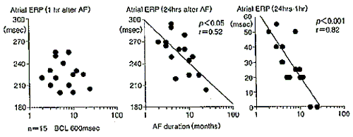この現象については慶応大学の先生方の興味深い検討3)があります。図3に示しますが、持続性心房細動で電気除細動を施行した15例で、除細動直後と24時間後に2度電気生理検査を行って心房筋の不応期を測定されています。多くの例で除細動直後より24時間後の方が不応期は延長しており、逆にいうと心房細動により不応期は短縮することが分かるわけですが、その短縮の程度あるいは除細動後の24時間の間に延長する度合いは、心房細動の持続時間が短いほうが、より大きいことが示されました。すなわち、電気的リモデリングは短期の心房細動では除細動により改善する(reverse remodeling)と考えられます。