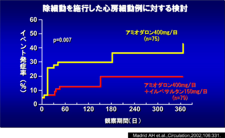 最初に、ARBが心房細動の再発予防に働くことを示したのは、スペインのMadridら4)です(図5)。かれらは、心房細動の除細動後の再発予防薬として、ヨーロッパで広く使用されているアミオダロンとこれに加えてARBのイルベサルタンを投与する2群に分けて、再発率を観察しています。興味深いことに、併用群において有意に再発が少なく、さらに、その効果は、除細動後の数週間で顕著です。