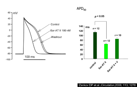 ここで、Allessie先生の図2に示した心房細動における心房リモデリングの考え方に戻りたいのですが、従来、RAA系の阻害により心房の構造的なリモデリングが抑制され、結果として心房細動の再発が抑えられると多くの実験で報告されていました。しかし、Madridらの知見(図5)では、ARB投与症例ではアミオダロン単独投与例に比べて、非常に早期の(2〜4週)心房細動再発を抑制しています。このことは、ARBが心房細動発症の初期から起こる心房の電気的リモデリング(図2)の抑制にも関与している可能性があります。電気生理学的な方法を用いて、われわれは、この点について検討してみました。 AngIIは心房筋のKチャネルを活性化することにより、その不応期を短縮し心房細動の電気的リモデリングを促進する モルモット心房筋細胞に、AngIIを投与すると、心房筋の遅延整流Kチャネルを活性し、その結果、心房の活動電位を短縮することが観察されました5)(図6)。不思議なことに、このようなKチャネルの活性化は心室筋細胞では認められませんでした。このことは、心房でAngIIのレベルが増加すると、その不応期が短縮し心房細動を維持するように働くことを意味します。したがって、ARBは、この情報伝達機構を阻害することで、心房の電気的リモデリングを抑えて、心房細動の再発を予防すると考えられます。紙面数の関係で、その内容を詳細に紹介できませんが、興味のある方は是非わたくしどもの論文(下に引用)をお読みください。