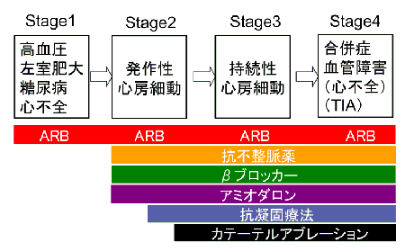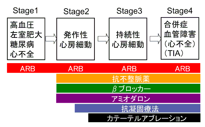 おわりに 心房細動患者の30%に高血圧症が合併すると言われています。すなわち、高血圧の患者は心房細動の重要な予備軍です。図7に、わたくしの心房細動治療に関わるコンセプトを示します。発症する前から、リスクファクターを治療するARBの投与は心房細動のupstream治療ということができます。
