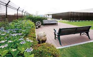 芝や植栽が植えられた屋上庭園