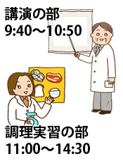 氏名(ふりがな)、年齢・性別、郵便番号・住所、電話番号、職業、講演の部 参加の有無、調理実習の部 参加の有無、来学される交通手段(電車or自家用車)を明記のうえ、お申し込みください。 |