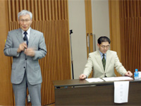 開講挨拶をする本学三ツ浪教授(左)と