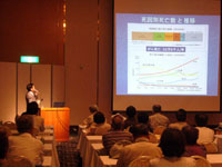 当日は猛暑のなか、定員を超える70名の参加があり、本学村田教授が司会を務めるなか、田中助教、河野助教による「放射線を使った切らずに治すがんの治療」についての講演が行われました。参加者は熱心に耳を傾けるとともに、活発な質疑応答が交わされました。