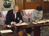 設置に先立ち、4月6日に滋賀県庁で馬場忠雄学長と嘉田由紀子滋賀県知事が出席し、「寄附講座の設置に関する協定書」の調印式が行われました。