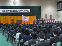 平成21度入学式が、4月7日(火)に本学体育館で挙行され、医学科学生94名、看護学科学生70名、大学院生(博士課程)30名、大学院生(修士課程)13名の新入生を迎え入れました。