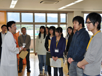 引き続き、水口医療センターの外観を見学し、宿泊施設へと向かいました。宿泊施設では、恒例の交流会として、地域で活躍されている先生方から地域医療の現状等について貴重なお話を聞かせていただいた後、訪問先の病院等の先生方やプチ里親の方々も交えて、意見交換・懇談を行いました。