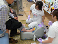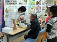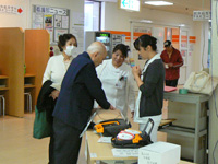 午前中には、附属病院ロビーにて、血圧測定、骨密度測定、血管年齢測定などの健康チェック及びAEDの使用方法説明を実施しました。大変多くの方に参加いただき、順番待ちの列ができるほどでした。