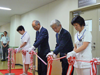 オープニングセレモニーには、馬場学長、柏木病院長、藤野看護部長、澤井センター長をはじめ、看護師や看護学科教員等約30名の出席があり、病院長及び学長のあいさつに続き、華々しくテープカットが行われました。