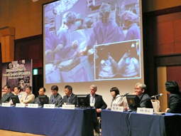 附属病院新手術室での浅井 徹教授(外科学講座心臓血管外科、本会会長)による2手術(難易度の高い僧帽弁形成術と心拍動下冠動脈バイパス手術)が、光ファイバーの回線により大阪の会場(ホテル阪神)に映し出されました。ベテランの心臓外科医から、心臓に興味のある研修医や医学部の学生、他の医療関係者まで客席はほぼ満席となりました。会場からは活発なディスカッションが聞かれ、手術手技や術中判断に関して従来の学会や研究会では体験できない実践的で臨場感溢れる学習の場となりました。
