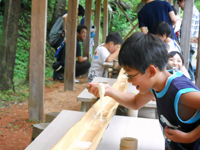 当日は時折強い雨が降る悪天候にも関わらず、約60名の参加者と、医療スタッフ、学生によるボランティア30名、計90名による大規模なキャンプとなりました。流しそうめん、BBQ(バーベキュー)、花火、バームクーヘン作りを行ったほか、医学生、看護学生が中心となりパネルクイズ等が実施され、とても充実した一日となりました。