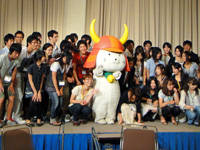 宿泊場所での交流会では、第1部に地域包括ケアセンターいぶきの畑野先生のご講演、第2部には、学外から彦根市副市長はじめ訪問先の病院関係の方々・里親・プチ里親の方々等20名の参加があり、とても盛大な交流会となりました。 なかでも、彦根市のご厚意により、サプライズで飛び入り参加した“ひこにゃん”は学生たちをあっという間に引きつけていました。