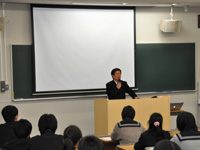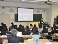 今回は第1回目ということで、膳所高校からは渕田学校長にもご出席いただき、開講に当たり、服部副学長と同校長から、生徒へご挨拶がありました。講義は、解剖学講座(神経形態学部門)の相見准教授に担当いただき、テーマを「形から知るからだのしくみ−解剖学・組織学−」として、時折、ユーモアも交えながら、解りやすくお話いただきました。生徒たちはやや緊張しながらも、講義内容をノートに書き留めるなど熱心な様子が見て取れました。講義終了後には、受講した生徒だけでなく、引率いただいた先生からも質問 がありました。