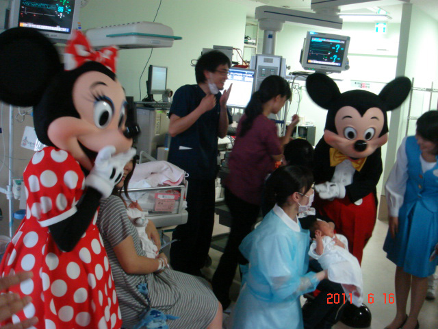 藤野看護部長が、病気療養中で東京ディズニーリゾートにいけない子供達のところに、ミッキーマウスが逢いに来ていただけたらと、手紙を書いて、今回の夢の時間が実現いたしました。