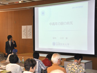 テーマは「中高年の方が悩まれる病気」と題し、前半は、整形外科・川崎 拓 講師から「中高年の膝の痛み」として、変形性膝関節症、関節リウマチ、人工関節を中心に講演いただき、後半は、眼科・川村 肇 講師から「中高年の眼の病気」として、加齢性黄斑変性、糖尿病網膜症を主な話題に講演いただきました。