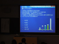 ターニングポイントの使用により、先生の訊ねた問題への受講生の回答が、画面上にグラフ化されて映し出され、講義は大いに盛り上がりました。受講生からは「スイッチを押して授業に参加することで、より興味をもつことができました」「私たちも参加できるクイズみたいなものもあってとてもよかったです」という感想が寄せられ、受講生参加型の授業に多くの方が満足している様子でした。