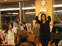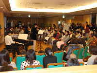 「ここは病院ということを忘れられるひと時を」という主催者の意向のもと、クリスマスソングや「川の流れのように」が披露され、また、「マル・マル・モリ・モリ!」では飛び入りの子どもさんたちとのダンスがあり、最後には「ふるさと」を来場者全員で合唱し、涙される方もみうけられるような感動の中でコンサートは終了しました。