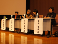 その後のパネルディスカッションでは、「男女共同参画社会形成の目的とは」をテーマに、聖泉大学教授 高橋啓子先生、立命館大学非常勤講師 伊田広行先生、滋賀医科大学附属病院女性診療科医員 竹林明枝先生、田中-貴邑 冨久子先生、そして座長の滋賀県医師会「医師のワーク・ライフ・バランスを考える会」木築野百合先生が、それぞれの専門分野から現実の問題や課題について発表され、新しい視点での男女共同参画社会形成について意見交換をし、会場の参加者からは「大変良い勉強になった」との意見が多数ありました。