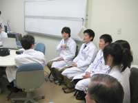 早速全員白衣に着替え、スチュ−デントドクターのシールを誇らしげに名札に付けて、少々緊張した顔つきで総合内科のカンファレンスに参加し、終了後、個別の指導医に付いていよいよ2週間の実習がスタートしました。