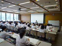 東大津高校とは、昨年度から本学看護学科において高大連携講座を開講していますが、この度、将来看護系大学への進学を希望している1・2年生の生徒(1日目:1年生25名、2年生19名、2日目:1年生29名、2年生21名)が同校澤教頭先生の引率のもと、本学を訪問しました。