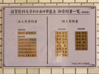 平成24年8月1日(水)に本学構内管理棟1階(正面を入り右側)に滋賀医科大学わかあゆ夢基金 ご寄附者銘板を設置しました。