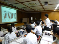 引き続き、解剖学講座(生体機能形態学部門)宇田川教授の「ヒトの体のつくりと疾病」と題した模擬授業が行われました。実際のエックス線画像を見ての読影問題もあり、みんな真剣な表情で取り組んでいました。