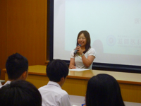 最初に西嶋校長先生から、本学の協力に対する謝辞を含め挨拶がありました。続いて、同校の先輩である医学科第2学年の小川 智恵美さんから、自身の受験対策や学生生活について話してもらいました。