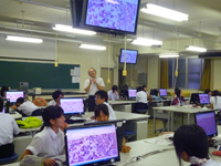午後からは病理学講座(分子診断病理学)の杉原教授から「がんからみた医学」と題し講義室での授業があり、加えて顕微鏡実習室でがんの組織をバーチャルスライドで見学しました。