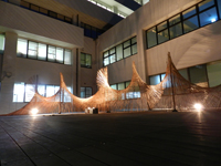 このたび、滋賀医科大学と成安造形大学との交流事業の一環として,病院の外来棟2階のウッドデッキ(憩いの広場)に、成安造形大学住環境デザインコースの学生さん達の制作によるモニュメントを展示いただきました。