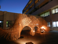 モニュメントは、琵琶湖のヨシを素材に作られており、すだれのように編むという手法で構成されていますが、それをねじることにより曲面をつくり、ダイナミックな作品となっています。