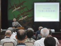第一部は「災害・地震」について、滋賀県防災危機管理局 蚊野主幹による「地震と身近な防災」、救急集中治療医学講座 田畑講師による「災害時の医療体制−DMATと医療救護班の活動−」の講演を行いました。
