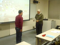 また、恒例により3回のうち2回以上受講いただいた方々には修了証書をお渡ししており、最終日には、田中教授から代表の方にお渡ししました。
