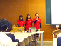 今回は、平成24年7月24日〜8月8日までサギノー・ヴァレー州立大学、その他4つの病院で研修を行った看護学科第4学年の佐藤 貴代さん、内山 真奈さん、市川 瑞希さんから研修報告があり、今後海外研修を希望する学生に対して出発までの準備等、アドバイスを含めて話をしていただきました。