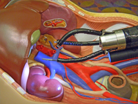 内視鏡手術ロボットを熱心に見る 嘉田滋賀県知事 |