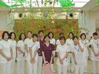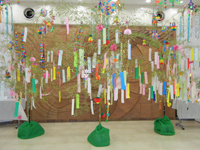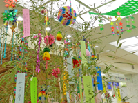 玄関ホール陶板前には、3本の笹が並べられており、「病気が早く治りますように」「おじいちゃんが元気になりますように」など、ご入院中の患者さん、外来患者さん、ご家族・ご友人の方々が願いを込めた短冊が一枚一枚かけられました。また、華やかな七夕飾りとともに天井には天の川をイメージした飾りつけなど季節を彩る飾りつけをしました。