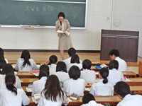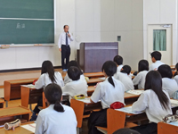 7月8日(月)には、光泉高校(草津市)を訪問し、医学科または看護学科志望の生徒32名を対象に、本学の概要及びカリキュラムや特色等について、医学科は扇田教授(生化学・分子生物学講座)から、看護学科は久留島准教授(基礎看護学講座)から、それぞれ分かりやすく説明を行いました。