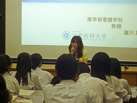 最初に、服部副学長から「お隣の高校でもあり、是非本学看護学科への進学を期待しています。」また、「今年本学にメディカルミュージアムが開設されたので、是非機会があれば見学に来てください。」と挨拶がありました。