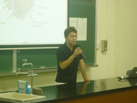 続いて、同校の先輩である医学科2年小西 快君に、「先輩からの一言」と題し、進路を決定した動機や大学生活について話してもらいました。小西君は小学校4年生のときから本学への進学を決めていたようで、そのために自分はどんなことをすべきか、ということを日々考えていたとのことで、生徒からは驚きの声が漏れていました。