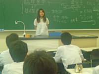 実習に先立ち、生化学・分子生物学講座(分子生理化学部門)縣 保年教授から生化学の授業の概要と先生の研究テーマについて説明があり、続いて、同校の先輩である医学科第2学年の吉澤 菜々さんから、自身の受験対策や学生生活について話してもらいました。生徒からは受験のことや今後の勉強方法等について質問がありました。